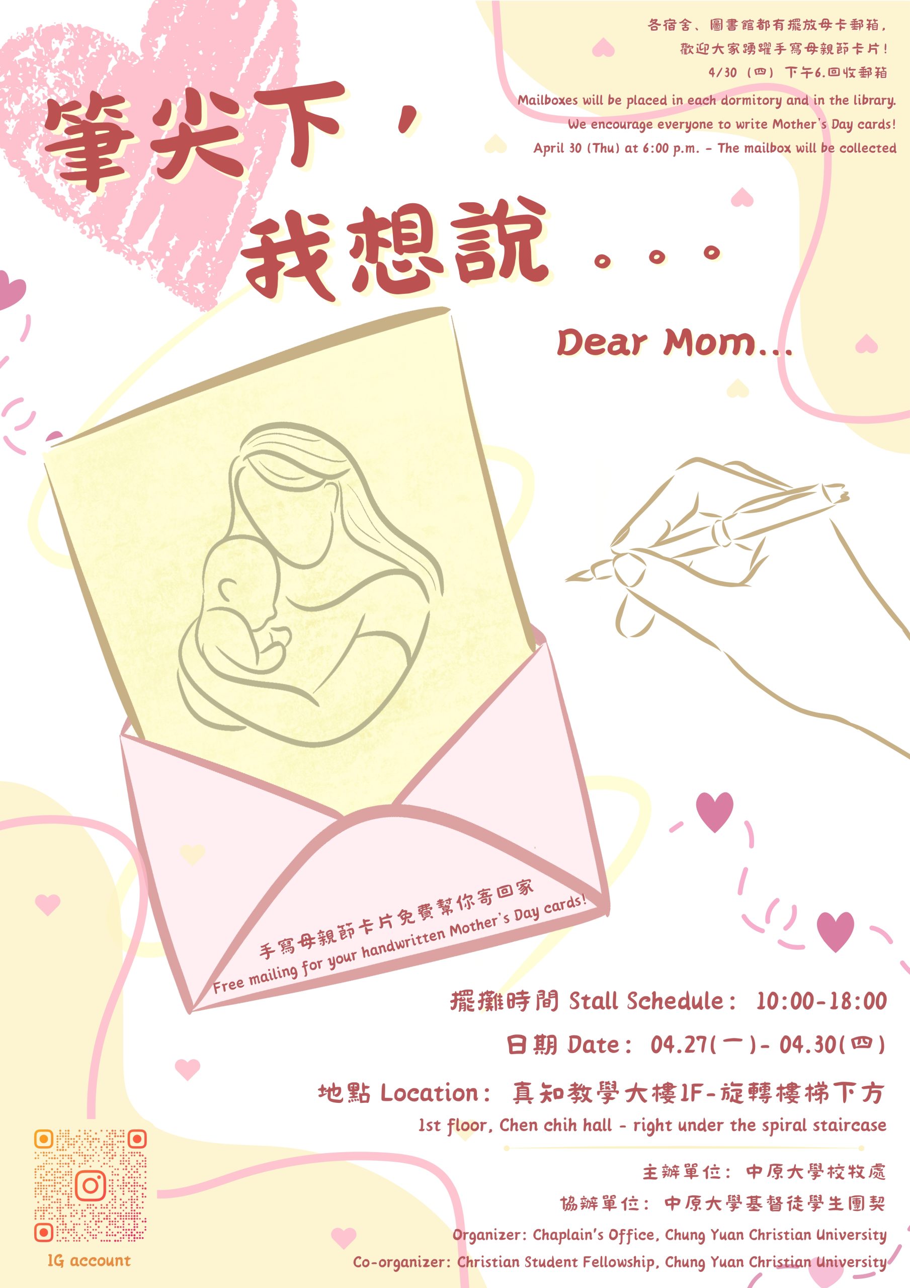 114學年度母親節卡片電子圖檔,歡迎下載使用。 2026-04-27 最新消息 114年度母親節卡片電子圖檔,請參用(左圖)。💐母親節卡片擺攤資訊(右圖)-4/27~4/30 每日10~18點 真知教學大樓一樓旋轉樓梯下方。母親節卡片設計比賽訂於115年5月7日晚上「母親節合唱比賽」中頒獎。母親節合唱比賽於115年5月7日(四)18時30分於全人教育村瑞麗堂舉行,歡迎到場聆聽。 You Might Also Like 2024/11/18 康克校牧短文分享「Sitting on the Throne 坐在寶座上」 2024-11-18 2024/03/11 歐力仁主任短文分享「心靈的活水」 2024-05-20 2025/11/24李信毅校牧短文分享【《璀璨時刻》】 2026-02-02